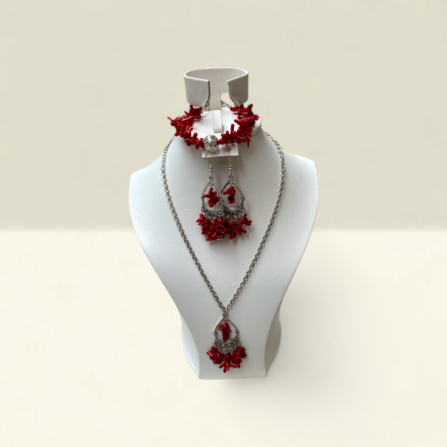 Parure élégante 3 pièces effet corail, composée d’un collier, de boucles d’oreilles et d’un bracelet. Un design inspiré du corail avec une finition raffinée, offrant un style chic et tendance sans être en corail naturel. Idéale pour sublimer vos tenues au quotidien ou lors des occasions spéciales. 💎