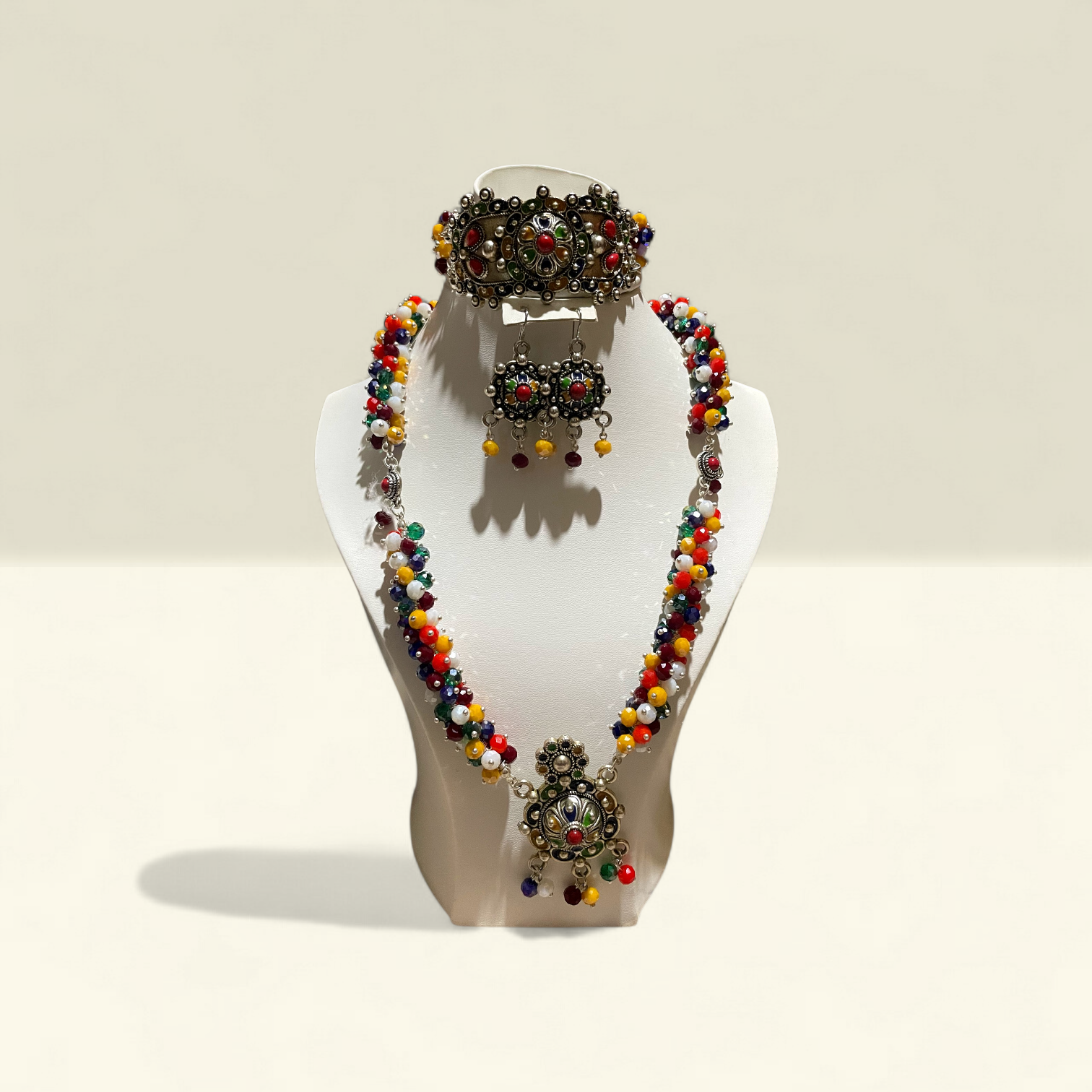 Parure kabyle traditionnelle 3 pièces en acier inoxydable, composée d’un collier, de boucles d’oreilles et d’un bracelet. Résistante à l’eau et à la rouille, elle allie durabilité et élégance. Inspirée du patrimoine kabyle, idéale pour sublimer vos tenues lors des occasions spéciales ou au quotidien. 💎